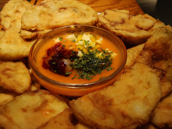 'Berenjenas con salmorejo' - Fried eggplant slices and salmorejo. Salmorejo comes from Córdoba and is a cold soup that is a bit thicker than gazpacho. This picture is from Lateral, a restaurant on c/Fuencarral, one of my favorite places to eat tapas.