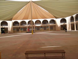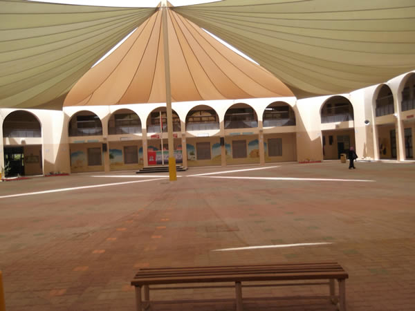 We followed Beverly through the door and into an open, round, courtyard. Maids were sweeping sand into piles trying to clean the space. A large yellow awning spread itself across the top of the open courtyard. Murals were painted on all the walls depicting Emirati culture. Children were playing, sitting, talking. We saw the classroom areas - thankfully the AC from the classroom provided relief from the oppressive heat - the gymnasium, a small stage with chairs set up in the auditorium, a computer room, and our office. Once finished we headed back towards the atrium and the main entrance.